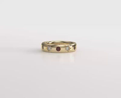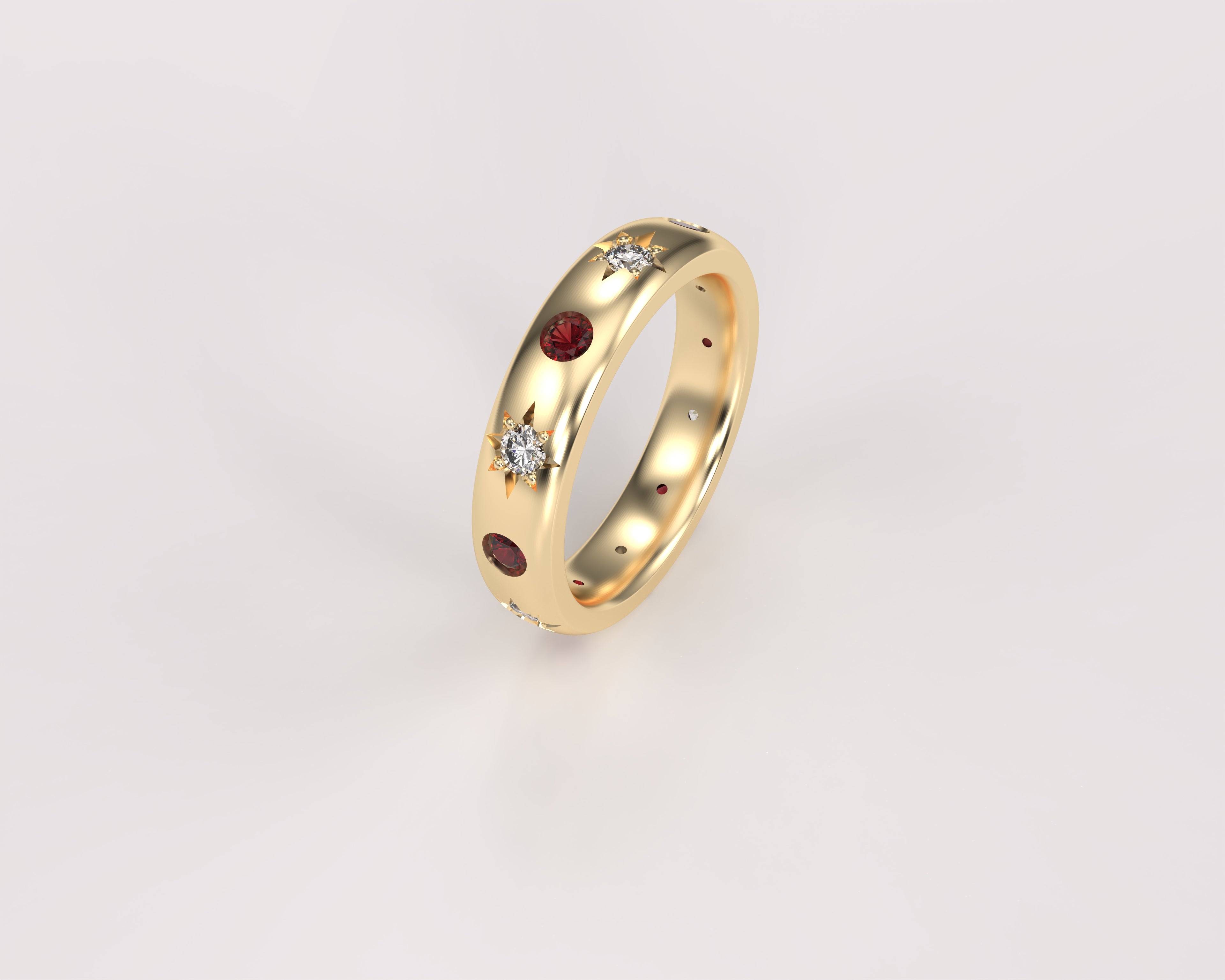 This redesign began with the customer’s mother’s original garnet eternity ring, a piece once worn daily and cherished deeply. The garnets were carefully extracted and reimagined into this new design, giving them a fresh chapter while still holding their history. To this foundation, natural diamonds, her mother’s birthstone, were added in an alternating rhythm with the garnets. Each diamond was star-set, a choice that was more than just aesthetic: it honours her mother as her guiding star, the light that continues to shine no matter where life leads.