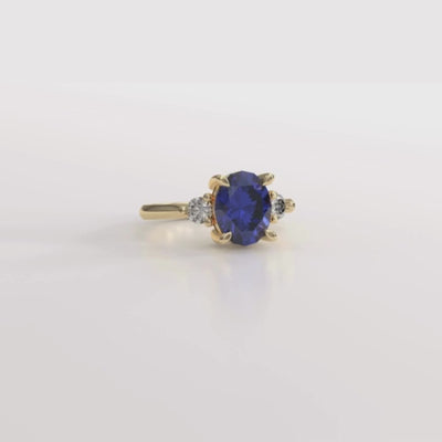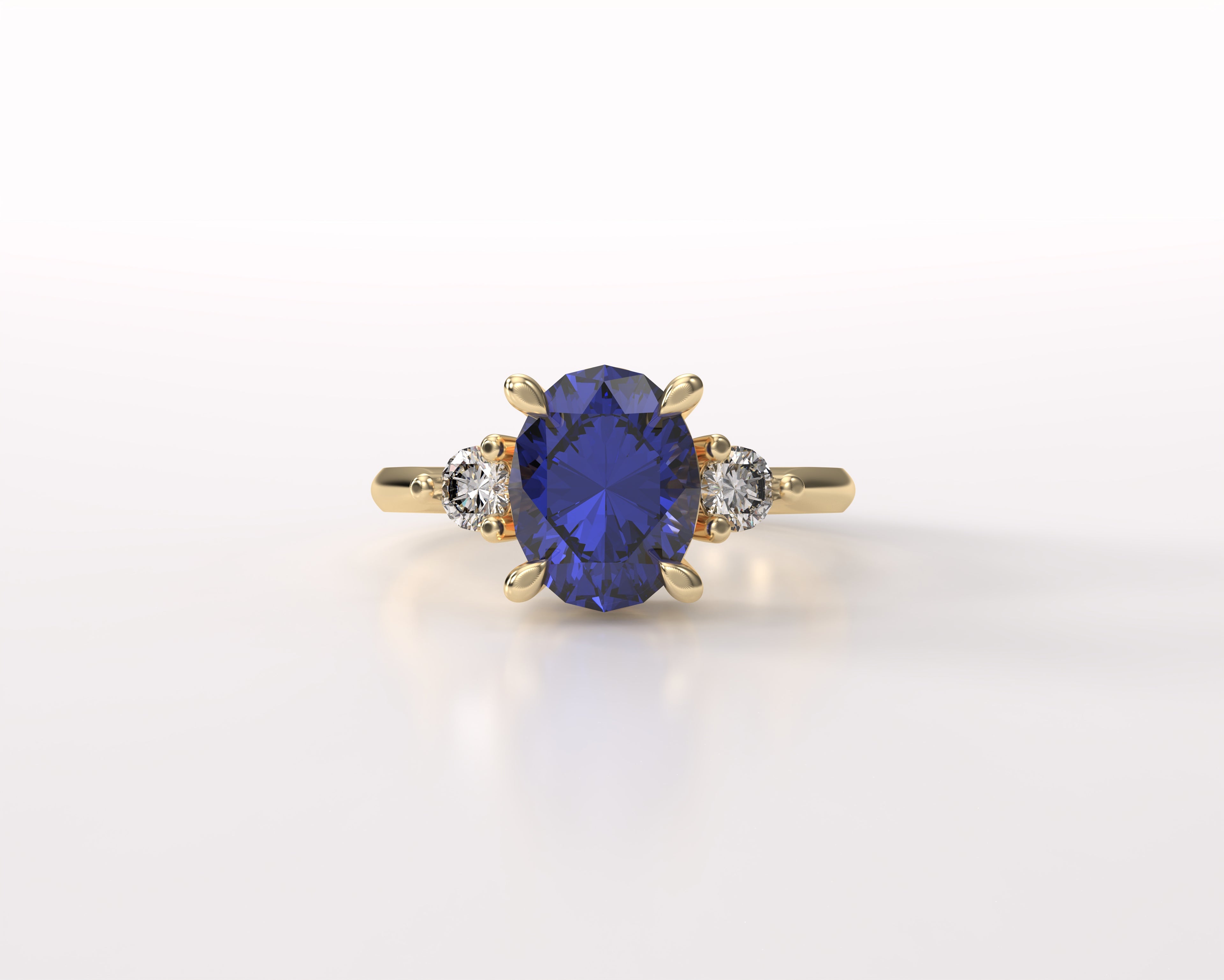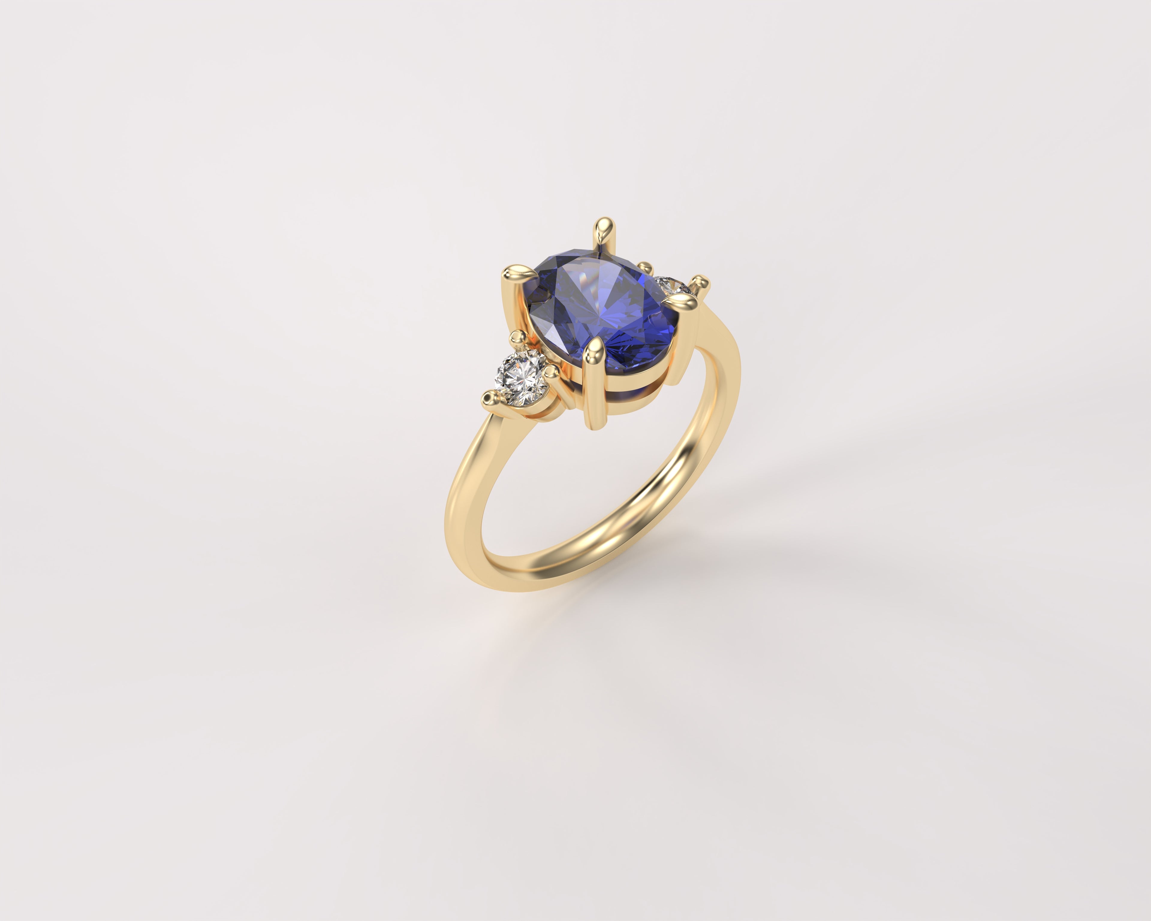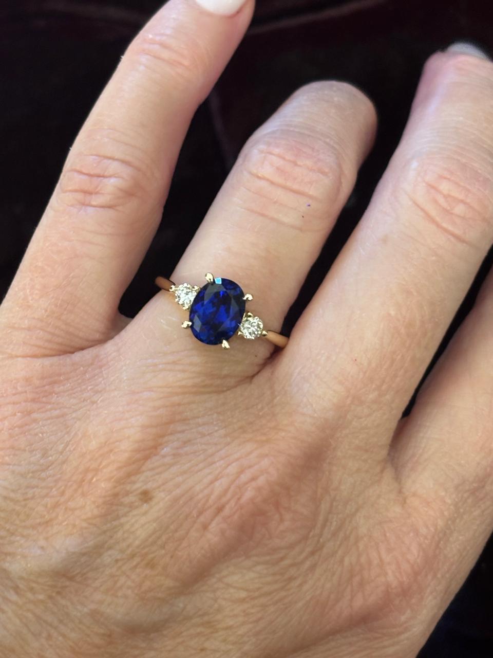 This customer came to us with a very clear vision: minimal yet clean, with a coloured gemstone at the centre. Together, we sourced the most exquisite oval lab-grown blue sapphire, set in a refined 14ct yellow gold four-claw design and flanked on either side by two natural round brilliant-cut diamonds. The result was understated, timeless, and bold in its simplicity, exactly as he had imagined.